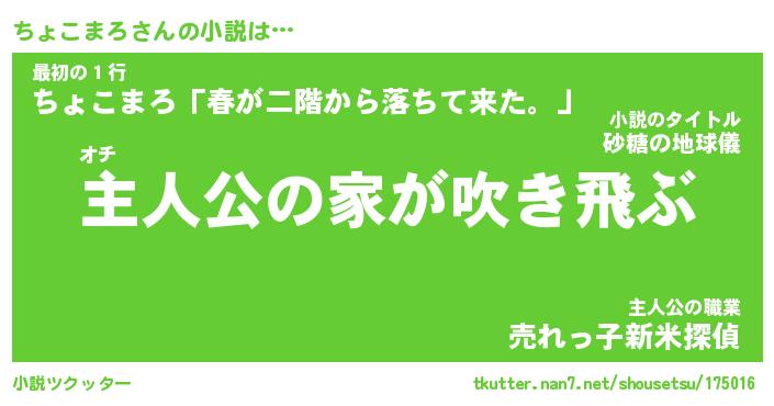 | 男性向けラノベタイトル風あだ名 | 『ちょこまろの憂鬱』 |