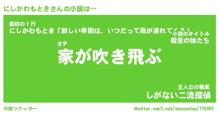 | 男性向けラノベタイトル風あだ名 | 『にしかわもときの憂鬱』 |