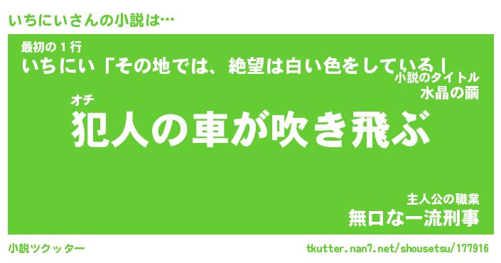 いちにいさんの小説は… オチ『犯人の車が吹き飛ぶ』最初の1行『いちにい「その地では、絶望は白い色をしている」』主人公の職業『無口な一流刑事』 ツクッター #小説ツクッター http://tkutter.nan7.net/shousetsu/177916/
