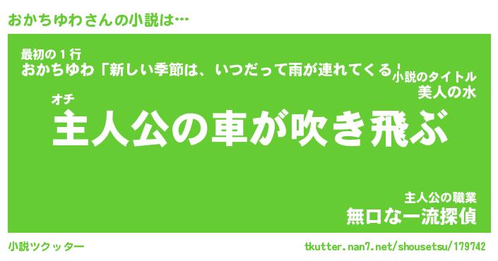 おかちゆわさんの小説は… オチ『主人公の車が吹き飛ぶ』最初の1行『おかちゆわ「新しい季節は、いつだって雨が連れてくる」』主人公の職業『無口な一流探偵』 ツクッター #小説ツクッター http://tkutter.nan7.net/shousetsu/179742/