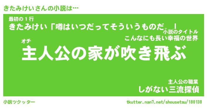 きたみけいさんの小説は… オチ『主人公の家が吹き飛ぶ』最初の1行『きたみけい「噂はいつだってそういうものだ。」』主人公の職業『しがない三流探偵』 ツクッター #小説ツクッター http://tkutter.nan7.net/shousetsu/180138/