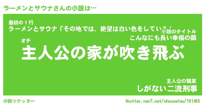 | 男性向けラノベタイトル風あだ名 | 『ラーメンとサウナの憂鬱』 |