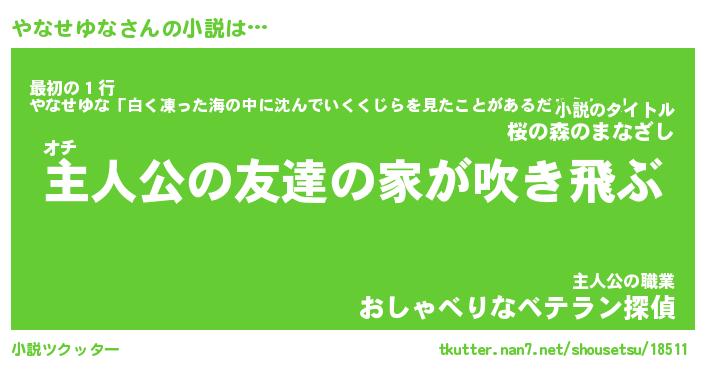 やなせゆなさんの小説は… オチ『主人公の友達の家が吹き飛ぶ』最初の1行『やなせゆな「白く凍った海の中に沈んでいくくじらを見たことがあるだろうか。」』主人公の職業『おしゃべりなベテラン探偵』 ツクッター #小説ツクッター http://tkutter.nan7.net/shousetsu/18511/
