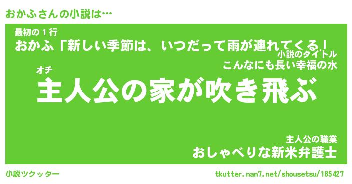 おかふさんの小説は… オチ『主人公の家が吹き飛ぶ』最初の1行『おかふ「新しい季節は、いつだって雨が連れてくる」』主人公の職業『おしゃべりな新米弁護士』 ツクッター #小説ツクッター http://tkutter.nan7.net/shousetsu/185427/