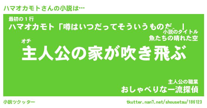ハマオカモトさんの小説は… オチ『主人公の家が吹き飛ぶ』最初の1行『ハマオカモト「噂はいつだってそういうものだ。」』主人公の職業『おしゃべりな一流探偵』 ツクッター #小説ツクッター http://tkutter.nan7.net/shousetsu/186123/