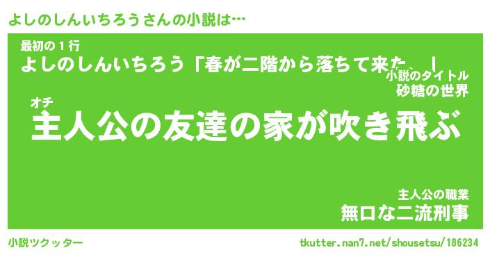 | 男性向けラノベタイトル風あだ名 | 『よしのしんいちろうの憂鬱』 |