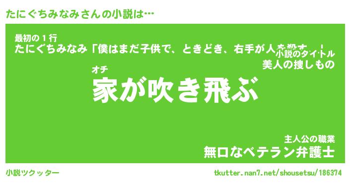 たにぐちみなみさんの小説は… オチ『家が吹き飛ぶ』最初の1行『たにぐちみなみ「僕はまだ子供で、ときどき、右手が人を殺す。」』主人公の職業『無口なベテラン弁護士』 ツクッター #小説ツクッター http://tkutter.nan7.net/shousetsu/186374/