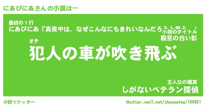 にあぴにあさんの小説は… オチ『犯人の車が吹き飛ぶ』最初の1行『にあぴにあ「真夜中は、なぜこんなにもきれいなんだろうと思う。」』主人公の職業『しがないベテラン探偵』 ツクッター #小説ツクッター http://tkutter.nan7.net/shousetsu/186831/