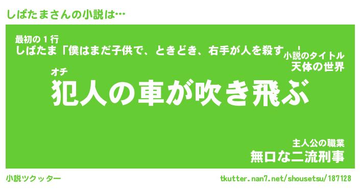 しばたまさんの小説は… オチ『犯人の車が吹き飛ぶ』最初の1行『しばたま「僕はまだ子供で、ときどき、右手が人を殺す。」』主人公の職業『無口な二流刑事』 ツクッター #小説ツクッター http://tkutter.nan7.net/shousetsu/187128/