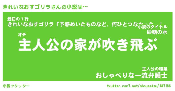 きれいなおすゴリラさんの小説は… オチ『主人公の家が吹き飛ぶ』最初の1行『きれいなおすゴリラ「予感めいたものなど、何ひとつなかった。」』主人公の職業『おしゃべりな一流弁護士』 ツクッター #小説ツクッター http://tkutter.nan7.net/shousetsu/187186/