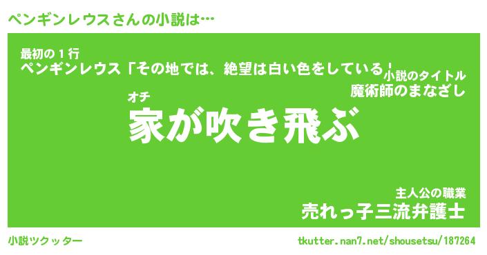 ペンギンレウスさんの小説は… オチ『家が吹き飛ぶ』最初の1行『ペンギンレウス「その地では、絶望は白い色をしている」』主人公の職業『売れっ子三流弁護士』 ツクッター #小説ツクッター http://tkutter.nan7.net/shousetsu/187264/