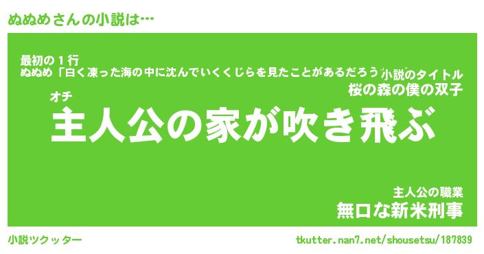 ぬぬめさんの小説は… オチ『主人公の家が吹き飛ぶ』最初の1行『ぬぬめ「白く凍った海の中に沈んでいくくじらを見たことがあるだろうか。」』主人公の職業『無口な新米刑事』 ツクッター #小説ツクッター http://tkutter.nan7.net/shousetsu/187839/