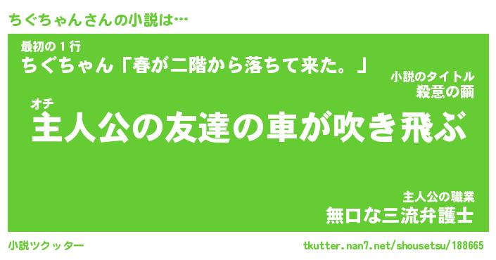 ちぐちゃんさんの小説は… オチ『主人公の友達の車が吹き飛ぶ』最初の1行『ちぐちゃん「春が二階から落ちて来た。」』主人公の職業『無口な三流弁護士』 ツクッター #小説ツクッター http://tkutter.nan7.net/shousetsu/188665/