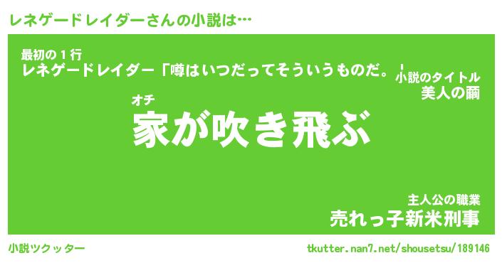 レネゲードレイダーさんの小説は… オチ『家が吹き飛ぶ』最初の1行『レネゲードレイダー「噂はいつだってそういうものだ。」』主人公の職業『売れっ子新米刑事』 ツクッター #小説ツクッター http://tkutter.nan7.net/shousetsu/189146/