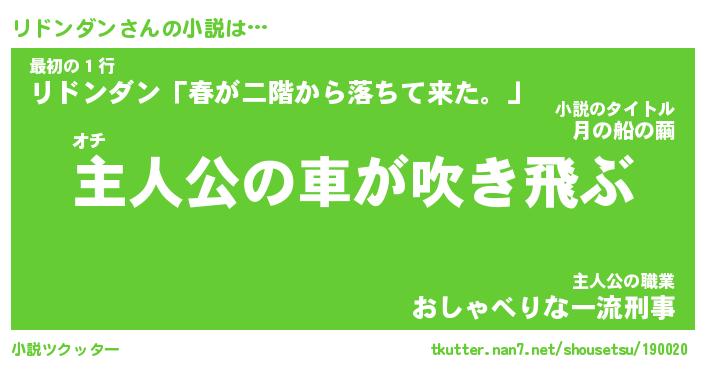 リドンダンさんの小説は… オチ『主人公の車が吹き飛ぶ』最初の1行『リドンダン「春が二階から落ちて来た。」』主人公の職業『おしゃべりな一流刑事』 ツクッター #小説ツクッター http://tkutter.nan7.net/shousetsu/190020/