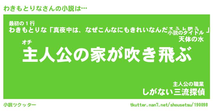 わきもとりなさんの小説は… オチ『主人公の家が吹き飛ぶ』最初の1行『わきもとりな「真夜中は、なぜこんなにもきれいなんだろうと思う。」』主人公の職業『しがない三流探偵』 ツクッター #小説ツクッター http://tkutter.nan7.net/shousetsu/190098/