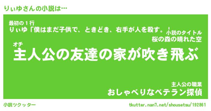 りぃゆさんの小説は… オチ『主人公の友達の家が吹き飛ぶ』最初の1行『りぃゆ「僕はまだ子供で、ときどき、右手が人を殺す。」』主人公の職業『おしゃべりなベテラン探偵』 ツクッター #小説ツクッター http://tkutter.nan7.net/shousetsu/192861/