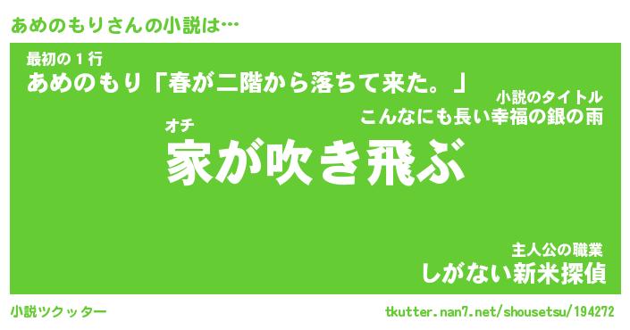 | 男性向けラノベタイトル風あだ名 | 『あめのもりの憂鬱』 |