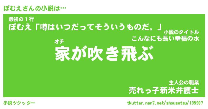 ぽむえさんの小説は… オチ『家が吹き飛ぶ』最初の1行『ぽむえ「噂はいつだってそういうものだ。」』主人公の職業『売れっ子新米弁護士』 ツクッター #小説ツクッター http://tkutter.nan7.net/shousetsu/195907/