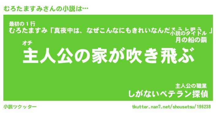 むろたますみさんの小説は… オチ『主人公の家が吹き飛ぶ』最初の1行『むろたますみ「真夜中は、なぜこんなにもきれいなんだろうと思う。」』主人公の職業『しがないベテラン探偵』 ツクッター #小説ツクッター http://tkutter.nan7.net/shousetsu/196238/