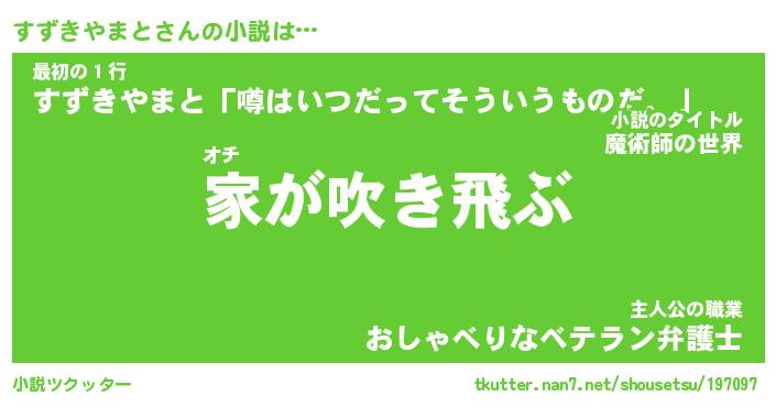 すずきやまとさんの小説は… オチ『家が吹き飛ぶ』最初の1行『すずきやまと「噂はいつだってそういうものだ。」』主人公の職業『おしゃべりなベテラン弁護士』 ツクッター #小説ツクッター http://tkutter.nan7.net/shousetsu/197097/