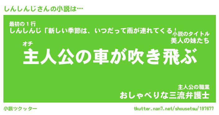しんしんじさんの小説は… オチ『主人公の車が吹き飛ぶ』最初の1行『しんしんじ「新しい季節は、いつだって雨が連れてくる」』主人公の職業『おしゃべりな三流弁護士』 ツクッター #小説ツクッター http://tkutter.nan7.net/shousetsu/197677/