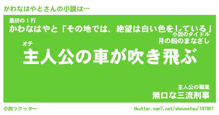 かわなはやとさんの小説は… オチ『主人公の車が吹き飛ぶ』最初の1行『かわなはやと「その地では、絶望は白い色をしている」』主人公の職業『無口な三流刑事』 ツクッター #小説ツクッター http://tkutter.nan7.net/shousetsu/197801/