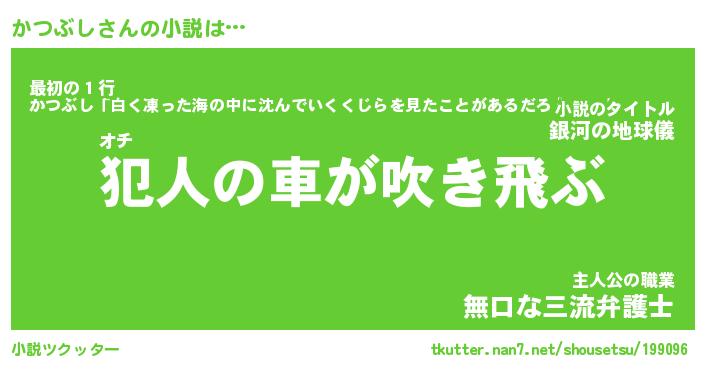 かつぶしさんの小説は… オチ『犯人の車が吹き飛ぶ』最初の1行『かつぶし「白く凍った海の中に沈んでいくくじらを見たことがあるだろうか。」』主人公の職業『無口な三流弁護士』 ツクッター #小説ツクッター http://tkutter.nan7.net/shousetsu/199096/