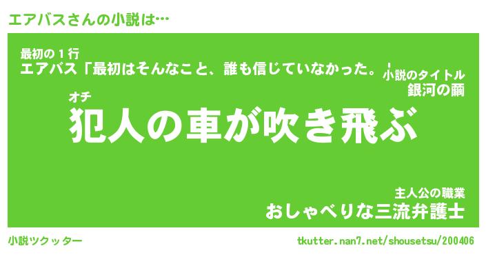 エアバスさんの小説は… オチ『犯人の車が吹き飛ぶ』最初の1行『エアバス「最初はそんなこと、誰も信じていなかった。」』主人公の職業『おしゃべりな三流弁護士』 ツクッター #小説ツクッター http://tkutter.nan7.net/shousetsu/200406/