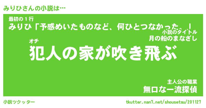 みりひさんの小説は… オチ『犯人の家が吹き飛ぶ』最初の1行『みりひ「予感めいたものなど、何ひとつなかった。」』主人公の職業『無口な一流探偵』 ツクッター #小説ツクッター http://tkutter.nan7.net/shousetsu/201127/