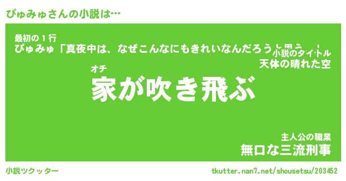 ぴゅみゅさんの小説は… オチ『家が吹き飛ぶ』最初の1行『ぴゅみゅ「真夜中は、なぜこんなにもきれいなんだろうと思う。」』主人公の職業『無口な三流刑事』 ツクッター #小説ツクッター http://tkutter.nan7.net/shousetsu/203452/