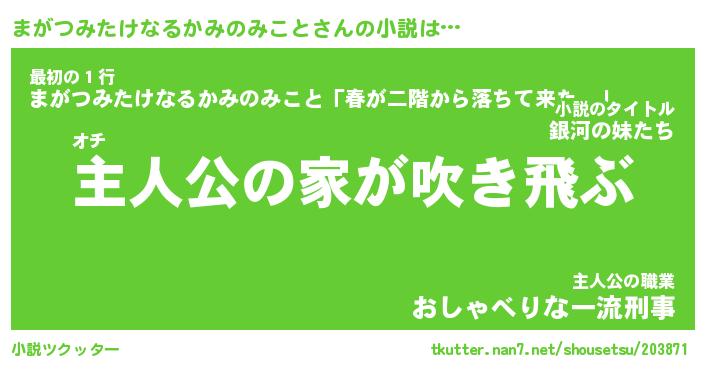 | 胡散臭い通販商品みたいなあだ名 | 『必ず成功するブレスレット…その名も「まがつみたけなるかみのみこと」』 |