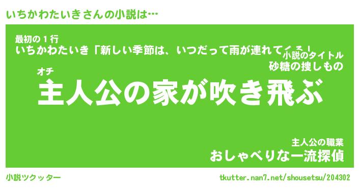 | 男性向けラノベタイトル風あだ名 | 『いちかわたいきの憂鬱』 |