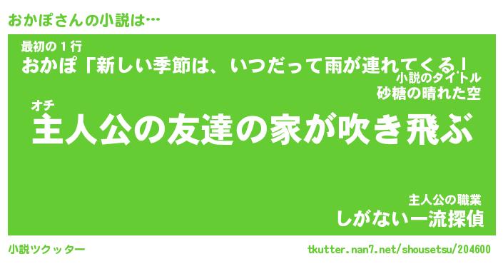 | 男性向けラノベタイトル風あだ名 | 『おかぽの憂鬱』 |