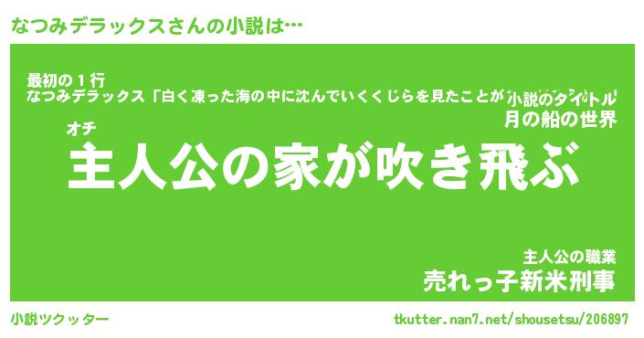 なつみデラックスさんの小説は… オチ『主人公の家が吹き飛ぶ』最初の1行『なつみデラックス「白く凍った海の中に沈んでいくくじらを見たことがあるだろうか。」』主人公の職業『売れっ子新米刑事』 ツクッター #小説ツクッター http://tkutter.nan7.net/shousetsu/206897/