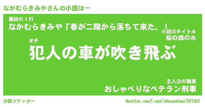なかむらきみやさんの小説は… オチ『犯人の車が吹き飛ぶ』最初の1行『なかむらきみや「春が二階から落ちて来た。」』主人公の職業『おしゃべりなベテラン刑事』 ツクッター #小説ツクッター http://tkutter.nan7.net/shousetsu/207432/