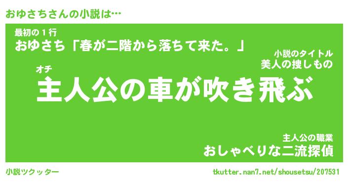 おゆさちさんの小説は… オチ『主人公の車が吹き飛ぶ』最初の1行『おゆさち「春が二階から落ちて来た。」』主人公の職業『おしゃべりな二流探偵』 ツクッター #小説ツクッター http://tkutter.nan7.net/shousetsu/207531/