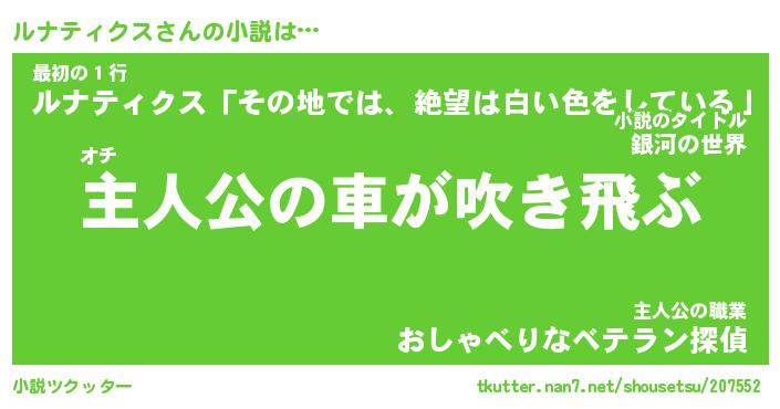 ルナティクスさんの小説は… オチ『主人公の車が吹き飛ぶ』最初の1行『ルナティクス「その地では、絶望は白い色をしている」』主人公の職業『おしゃべりなベテラン探偵』 ツクッター #小説ツクッター http://tkutter.nan7.net/shousetsu/207552/