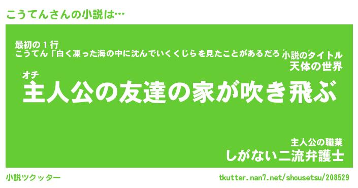 こうてんさんの小説は… オチ『主人公の友達の家が吹き飛ぶ』最初の1行『こうてん「白く凍った海の中に沈んでいくくじらを見たことがあるだろうか。」』主人公の職業『しがない二流弁護士』 ツクッター #小説ツクッター http://tkutter.nan7.net/shousetsu/208529/