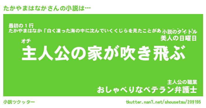 たかやまはなかさんの小説は… オチ『主人公の家が吹き飛ぶ』最初の1行『たかやまはなか「白く凍った海の中に沈んでいくくじらを見たことがあるだろうか。」』主人公の職業『おしゃべりなベテラン弁護士』 ツクッター #小説ツクッター http://tkutter.nan7.net/shousetsu/209195/