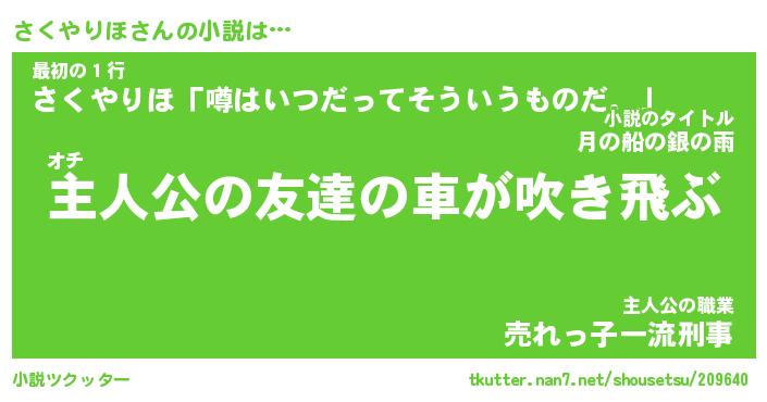 さくやりほさんの小説は… オチ『主人公の友達の車が吹き飛ぶ』最初の1行『さくやりほ「噂はいつだってそういうものだ。」』主人公の職業『売れっ子一流刑事』 ツクッター #小説ツクッター http://tkutter.nan7.net/shousetsu/209640/