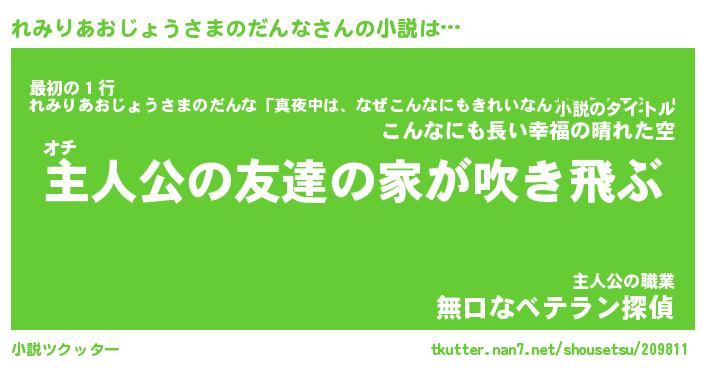 れみりあおじょうさまのだんなさんの小説は… オチ『主人公の友達の家が吹き飛ぶ』最初の1行『れみりあおじょうさまのだんな「真夜中は、なぜこんなにもきれいなんだろうと思う。」』主人公の職業『無口なベテラン探偵』 ツクッター #小説ツクッター http://tkutter.nan7.net/shousetsu/209811/