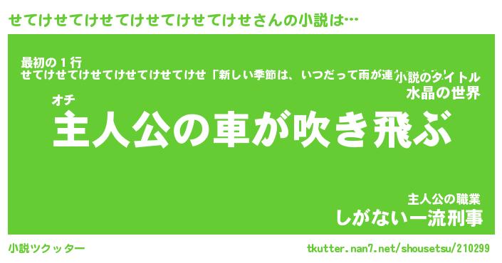 | 男性向けラノベタイトル風あだ名 | 『せてけせてけせてけせてけせてけせの憂鬱』 |