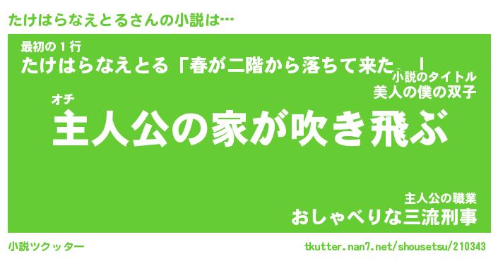 | 男性向けラノベタイトル風あだ名 | 『たけはらなえとるの憂鬱』 |