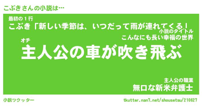 こぶきさんの小説は… オチ『主人公の車が吹き飛ぶ』最初の1行『こぶき「新しい季節は、いつだって雨が連れてくる」』主人公の職業『無口な新米弁護士』 ツクッター #小説ツクッター http://tkutter.nan7.net/shousetsu/210627/