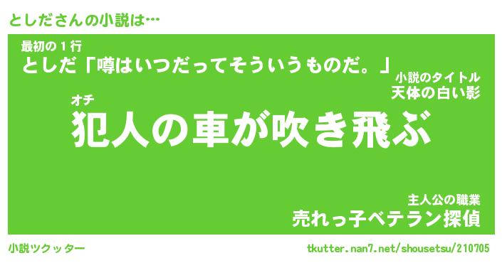 としださんの小説は… オチ『犯人の車が吹き飛ぶ』最初の1行『としだ「噂はいつだってそういうものだ。」』主人公の職業『売れっ子ベテラン探偵』 ツクッター #小説ツクッター http://tkutter.nan7.net/shousetsu/210705/