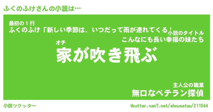 ふくのふけさんの小説は… オチ『家が吹き飛ぶ』最初の1行『ふくのふけ「新しい季節は、いつだって雨が連れてくる」』主人公の職業『無口なベテラン探偵』 ツクッター #小説ツクッター http://tkutter.nan7.net/shousetsu/211544/