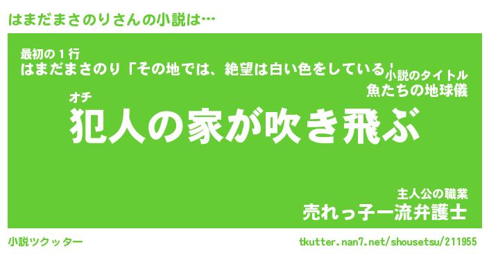 はまだまさのりさんの小説は… オチ『犯人の家が吹き飛ぶ』最初の1行『はまだまさのり「その地では、絶望は白い色をしている」』主人公の職業『売れっ子一流弁護士』 ツクッター #小説ツクッター http://tkutter.nan7.net/shousetsu/211955/