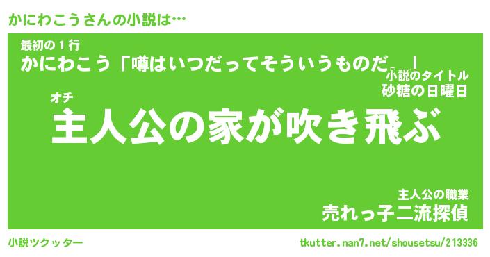 かにわこうさんの小説は… オチ『主人公の家が吹き飛ぶ』最初の1行『かにわこう「噂はいつだってそういうものだ。」』主人公の職業『売れっ子二流探偵』 ツクッター #小説ツクッター http://tkutter.nan7.net/shousetsu/213336/