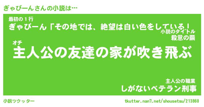 ぎゃびーんさんの小説は… オチ『主人公の友達の家が吹き飛ぶ』最初の1行『ぎゃびーん「その地では、絶望は白い色をしている」』主人公の職業『しがないベテラン刑事』 ツクッター #小説ツクッター http://tkutter.nan7.net/shousetsu/213860/